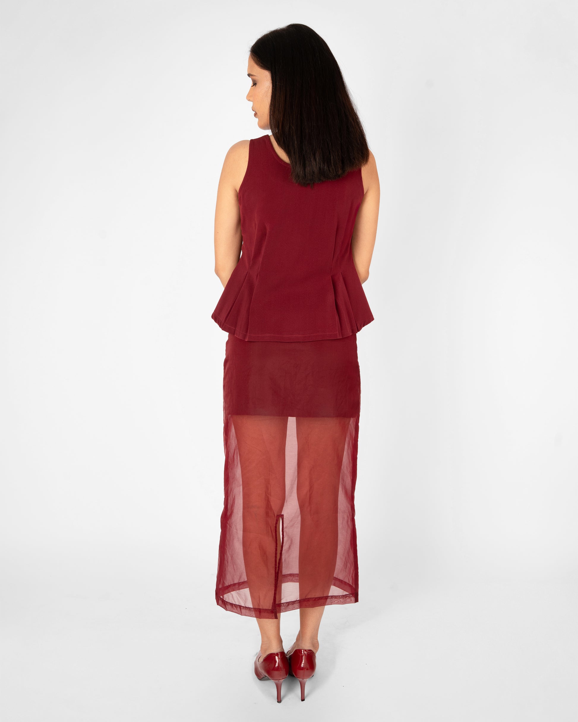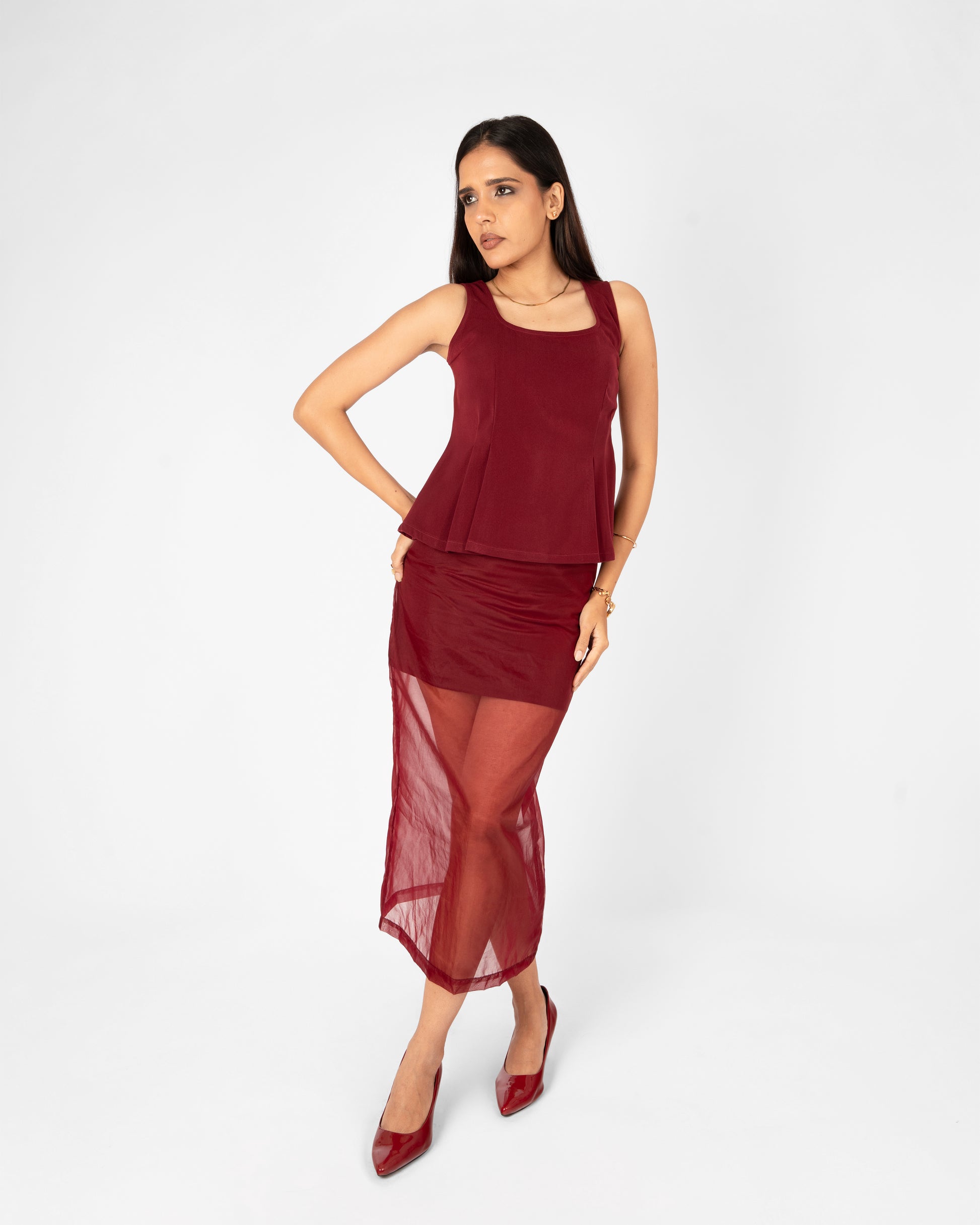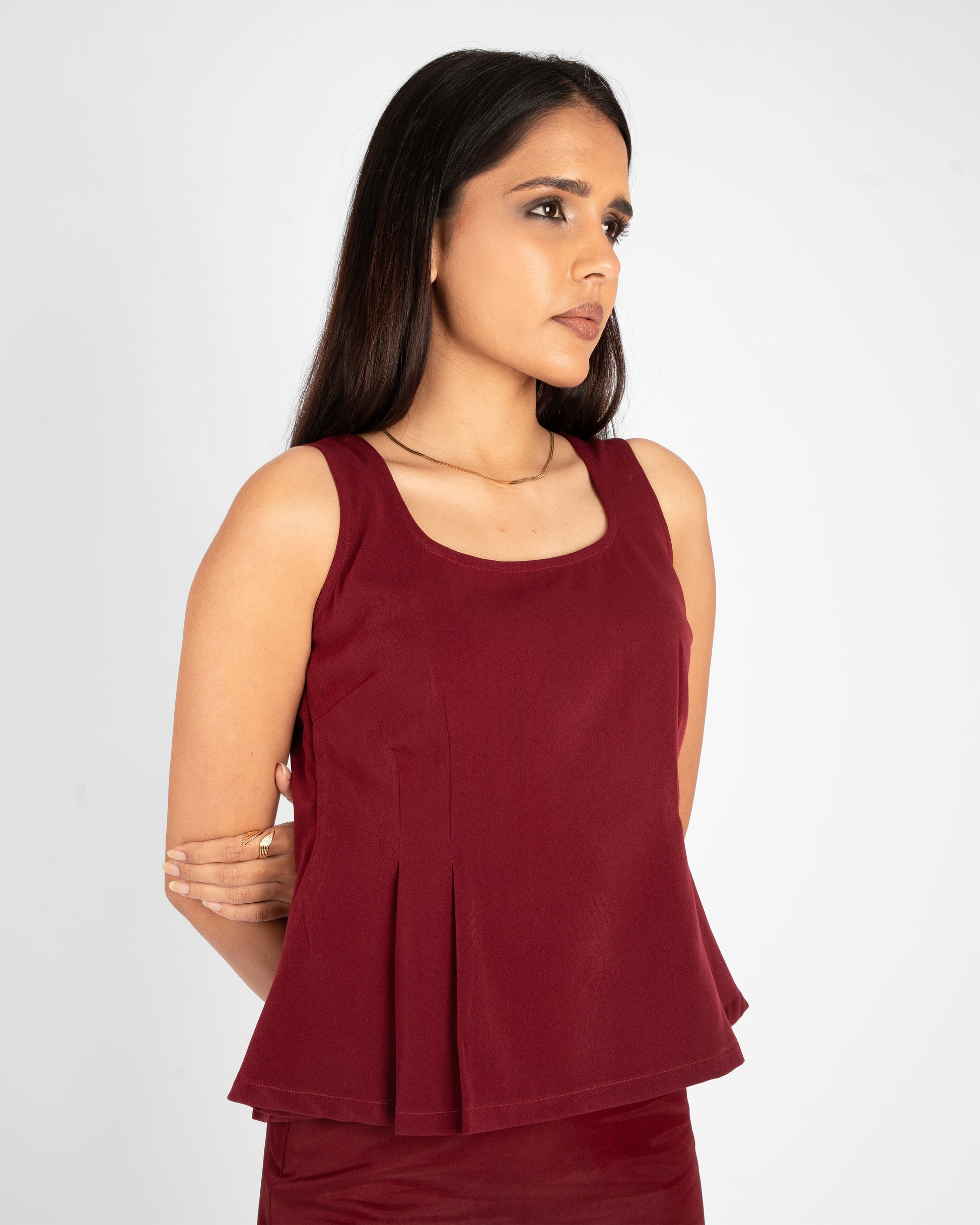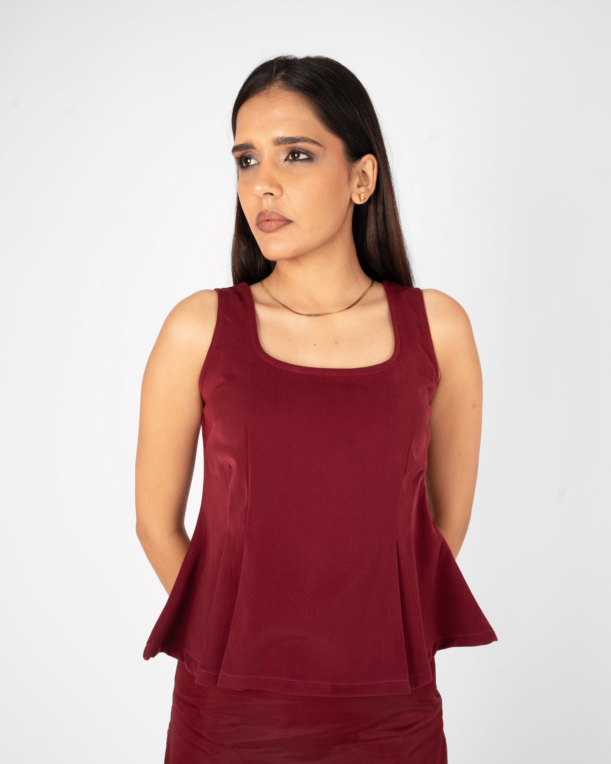 Elevate your desk-to-dinner wardrobe with our Midnight Muse Peplum Top. Defined by its architectural peplum hem and Burgundy hue, this piece offers a tailored silhouette that flatters every frame. The top features wide square neckline and crisp pleats.