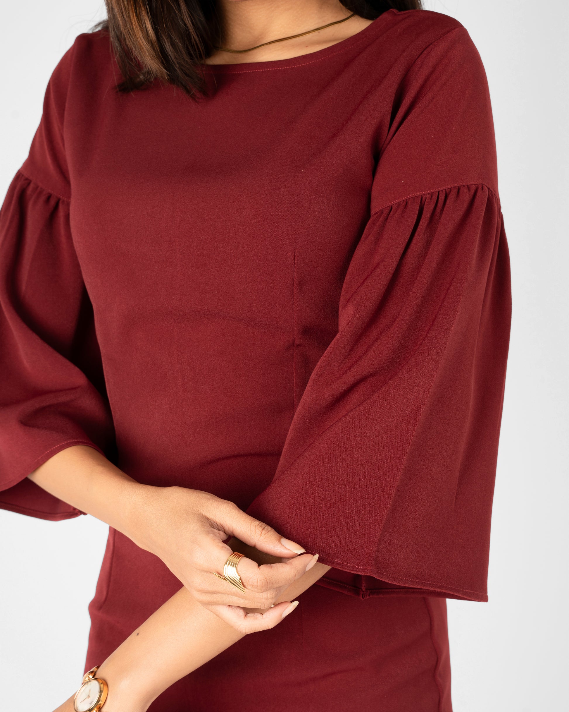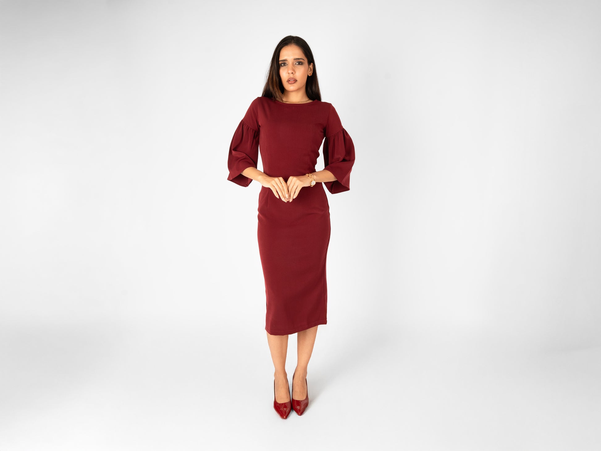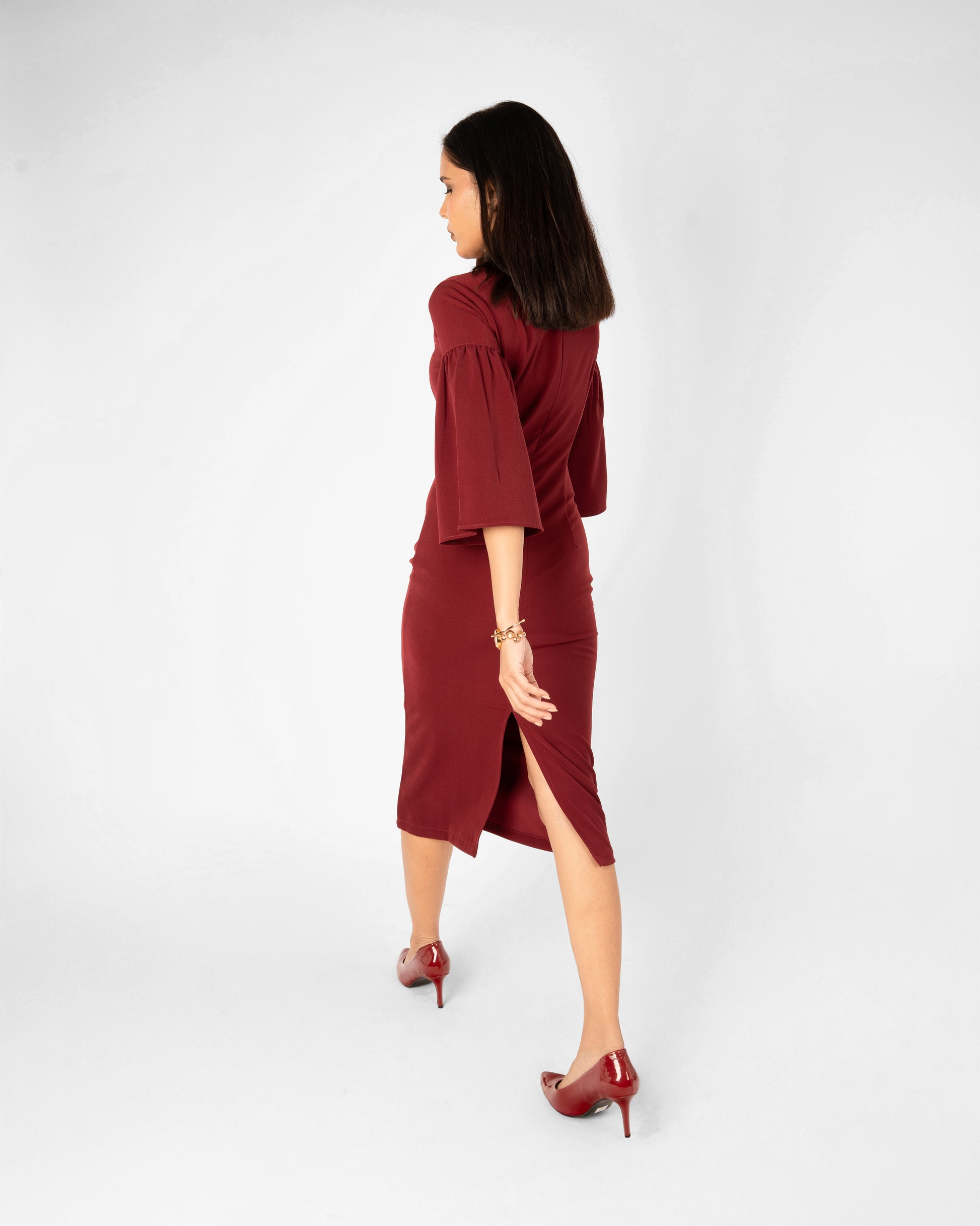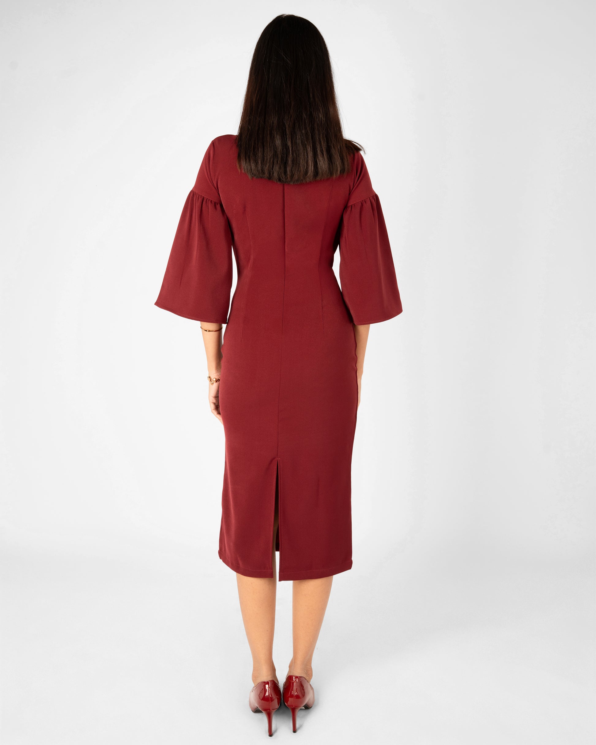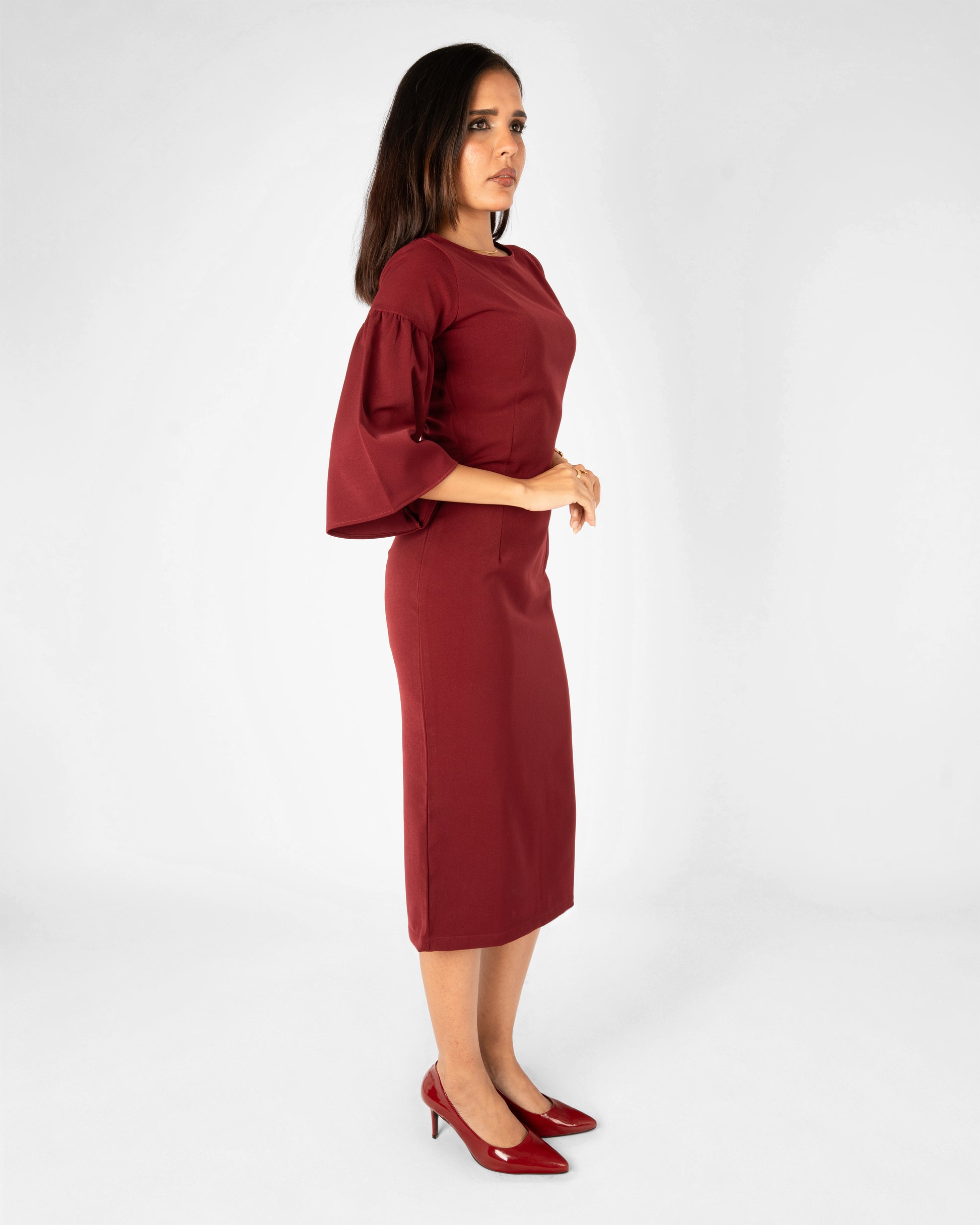 The Scarlet Dress is a striking statement of sophisticated femininity, designed to command attention with its bold hue and dramatic architectural details. This midi-length piece blends a classic form-fitting silhouette with contemporary flair, making it an ideal choice for gallery openings, evening soirées, or high-impact professional events.